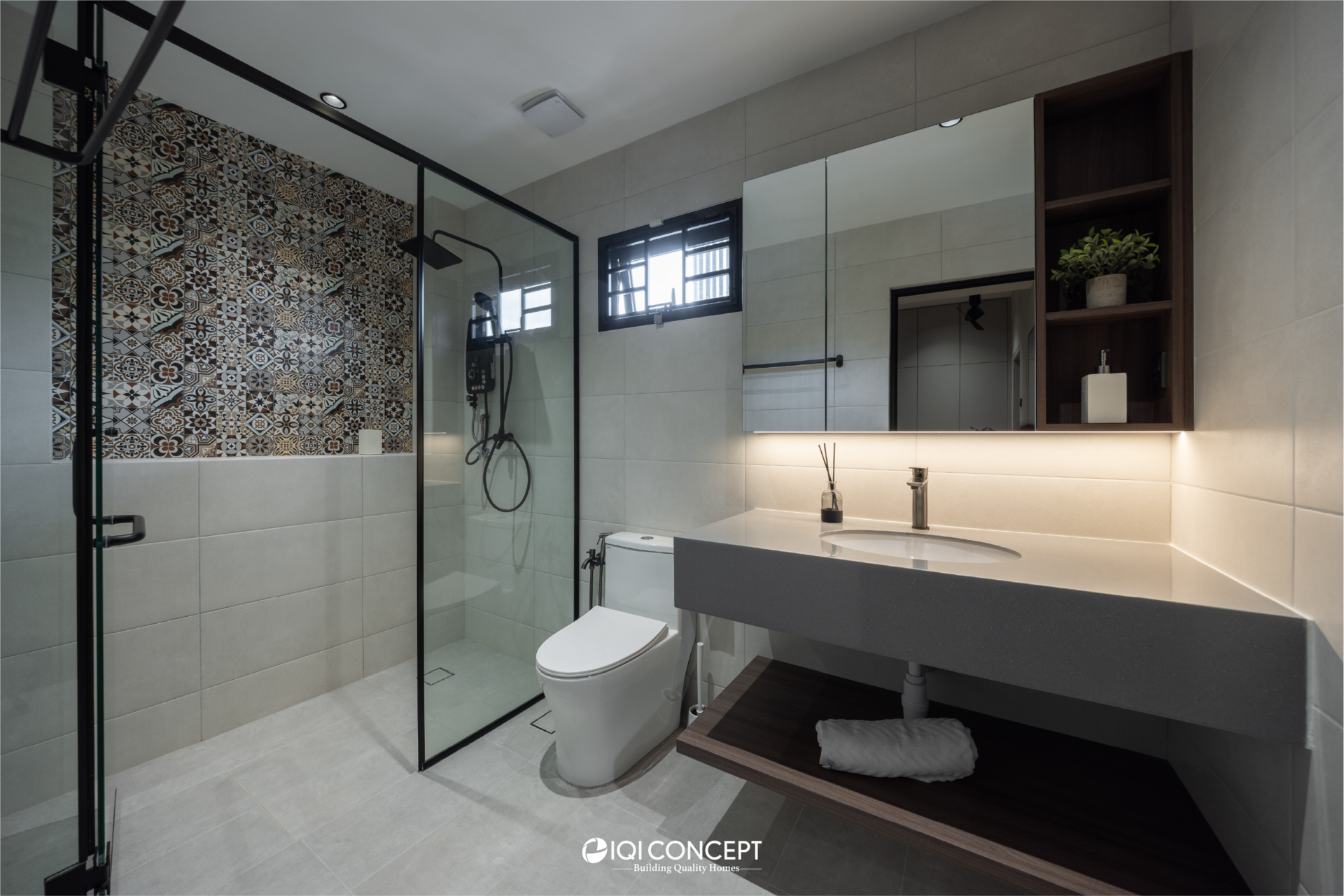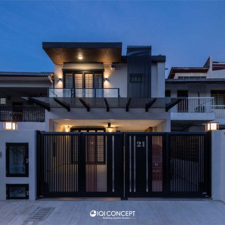 The kitchen was upgraded with a grey-wood palette and contemporary cabinetry, complementing the open layout, while the powder room features half-height retro wall tiles for a cozy yet spacious feel. On the exterior, the first-floor façade was refreshed with vertical louvers that harmonize with the autogate’s design, and the shoe rack area features stylish black retro tiles, adding both function and visual appeal. The result is a mature yet inviting transformation, darker in tone yet balanced with warmth and tailored for modern living while honoring the charm of a long-standing home.