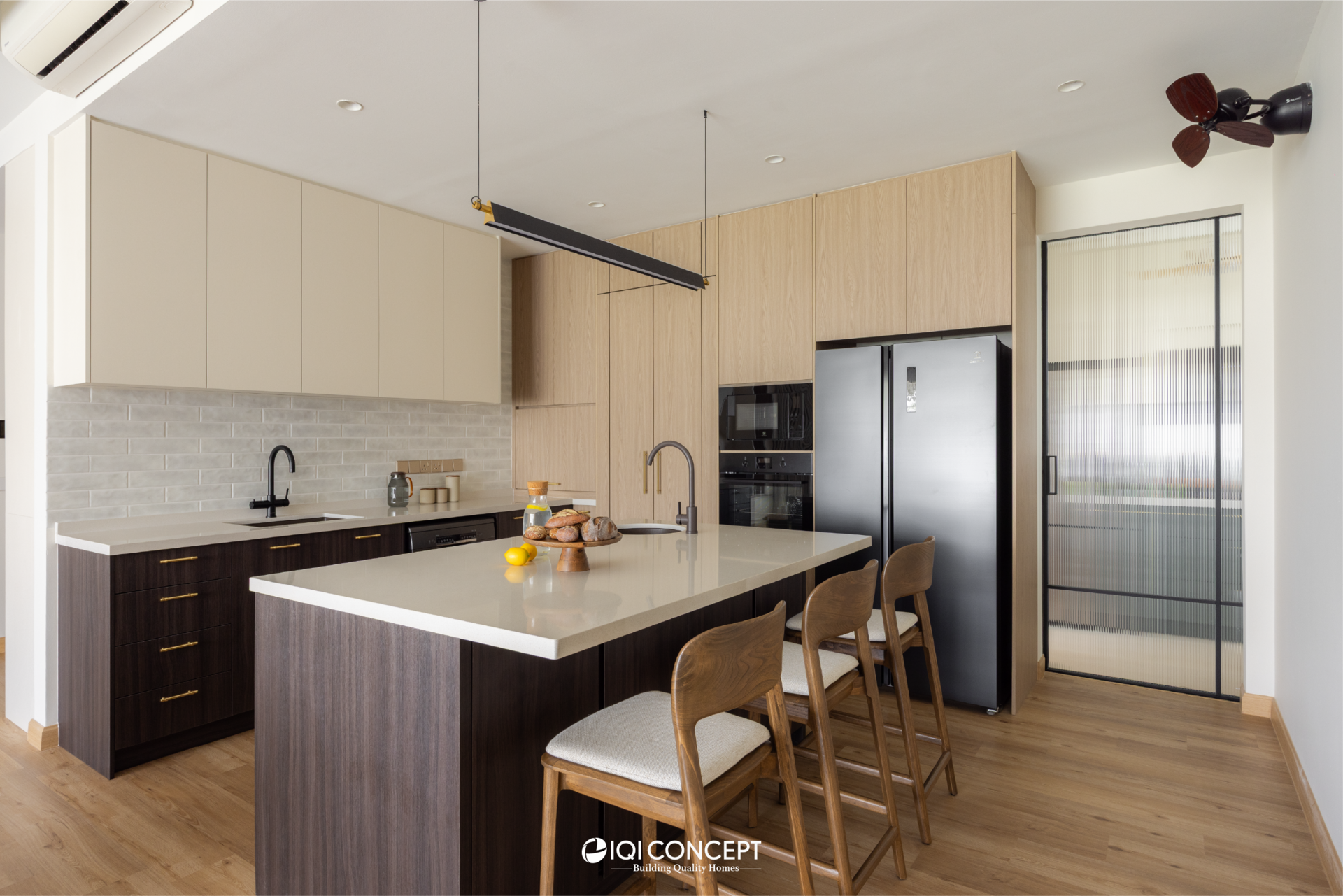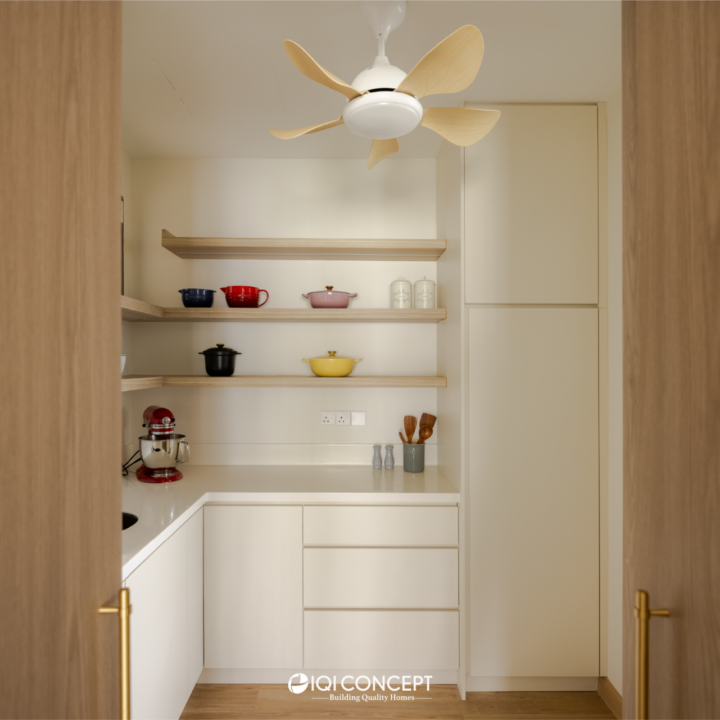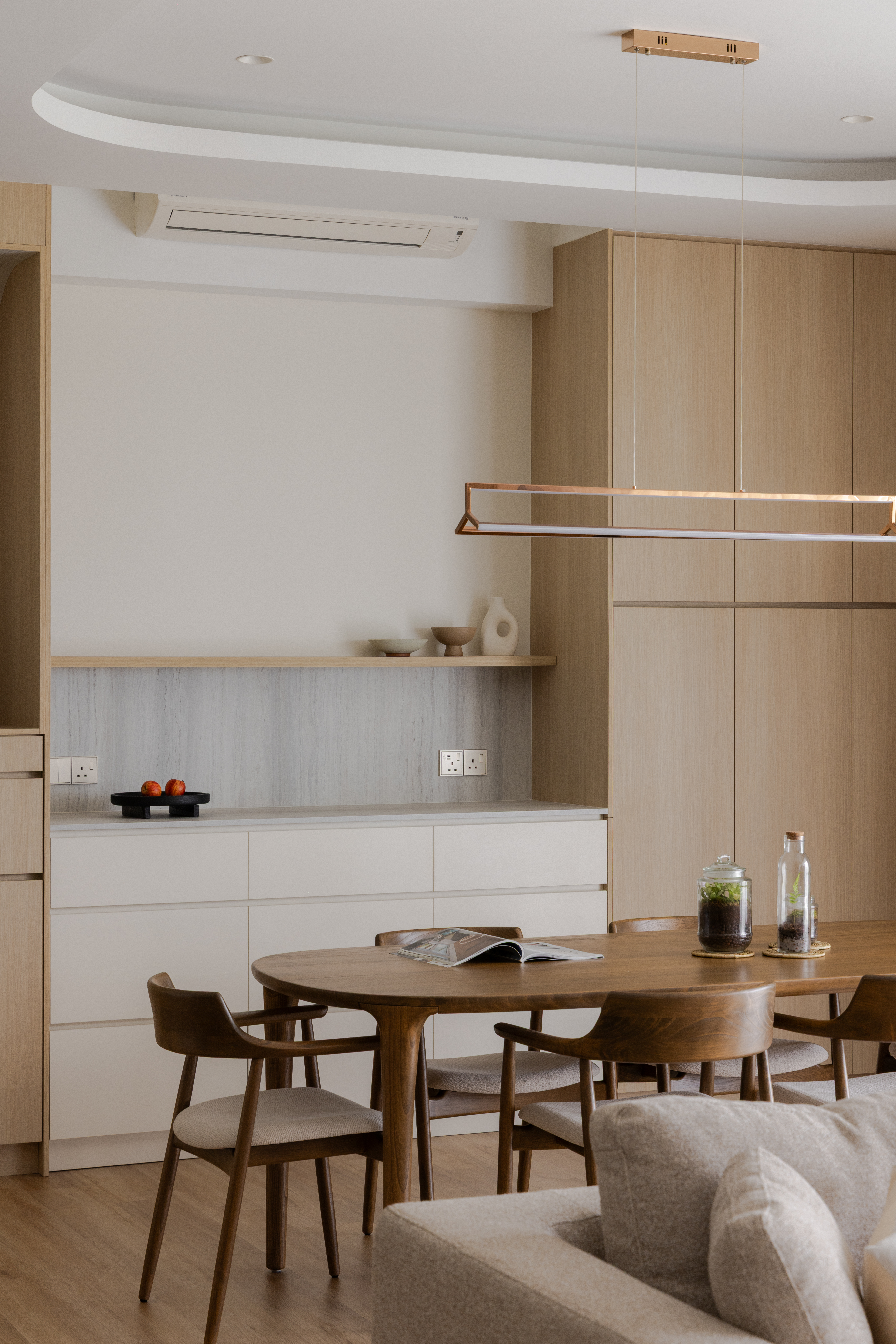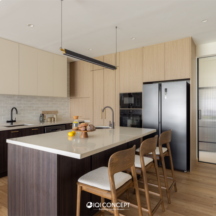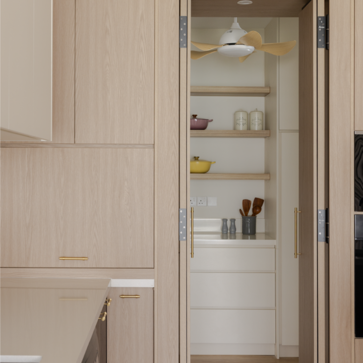 A mix of light wood and deeper wood tones defines the dry kitchen, creating contrast while maintaining harmony within the overall palette. The island becomes the visual anchor of the space, finished in a deeper timber tone and paired with a light countertop to brighten the composition. A concealed walk-in pantry hidden behind custom carpentry doors ensure everyday functionality without compromising aesthetics.