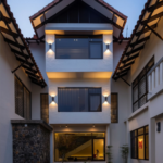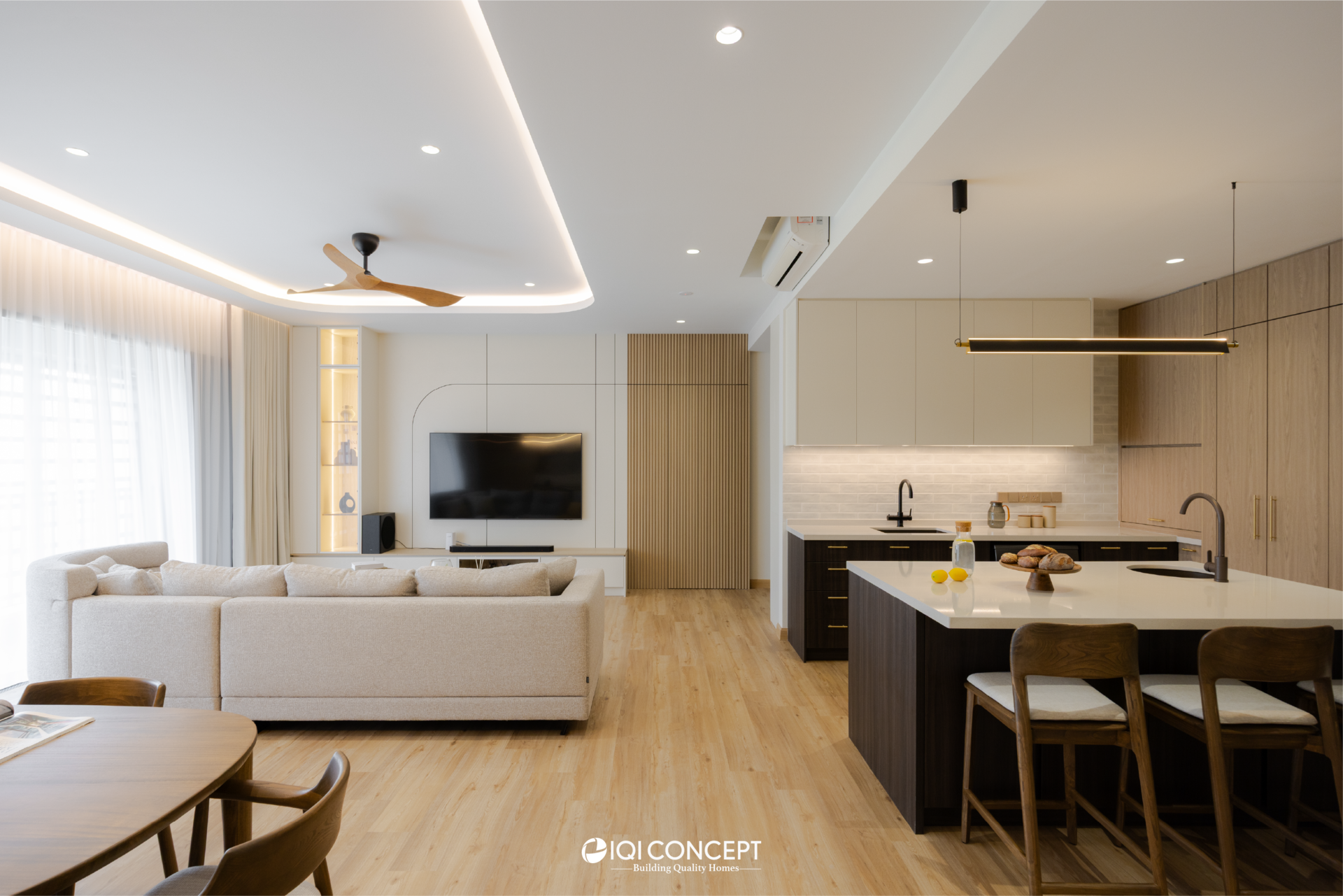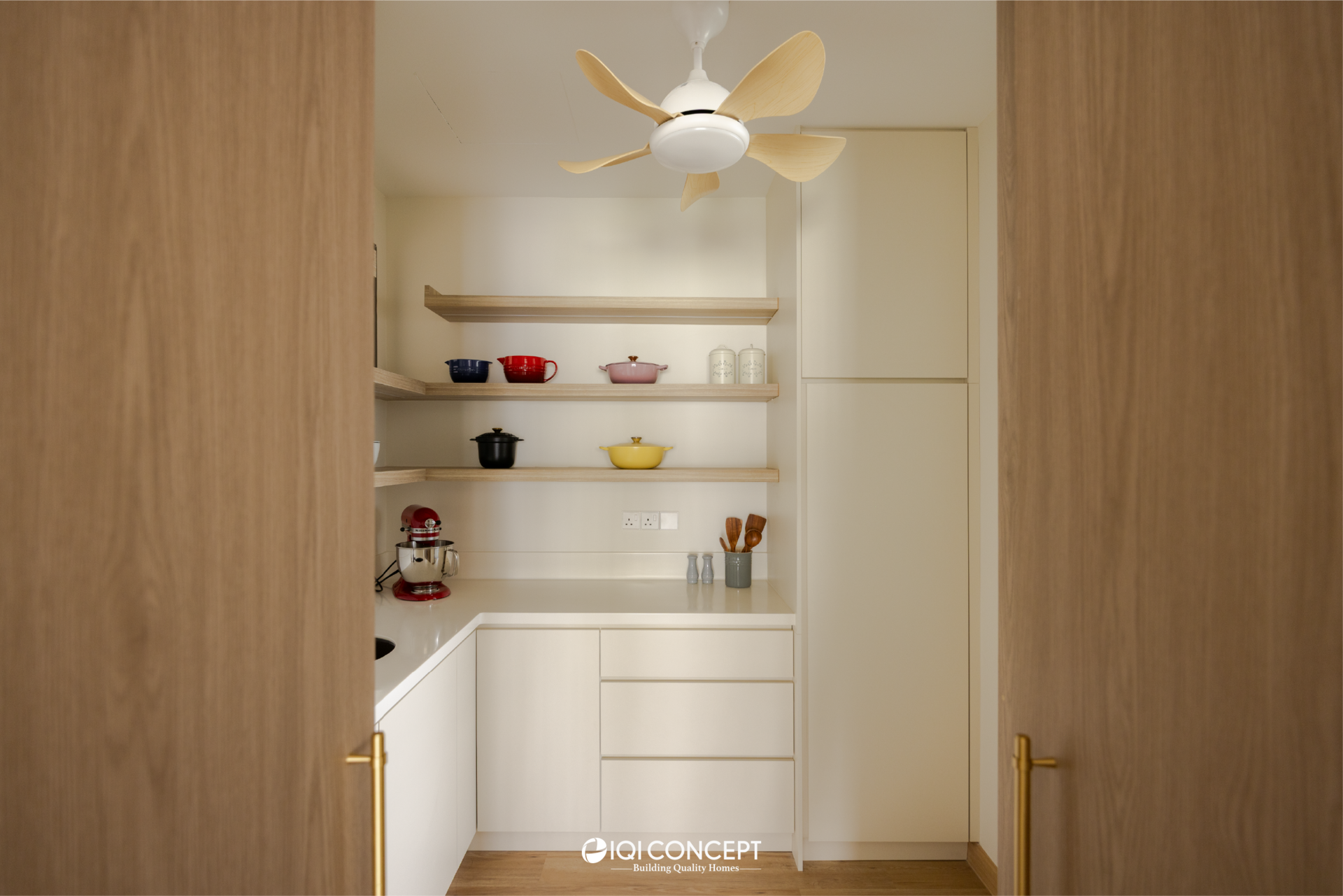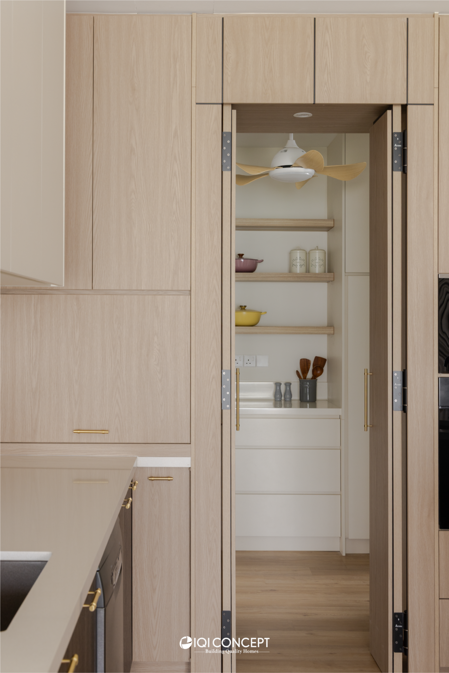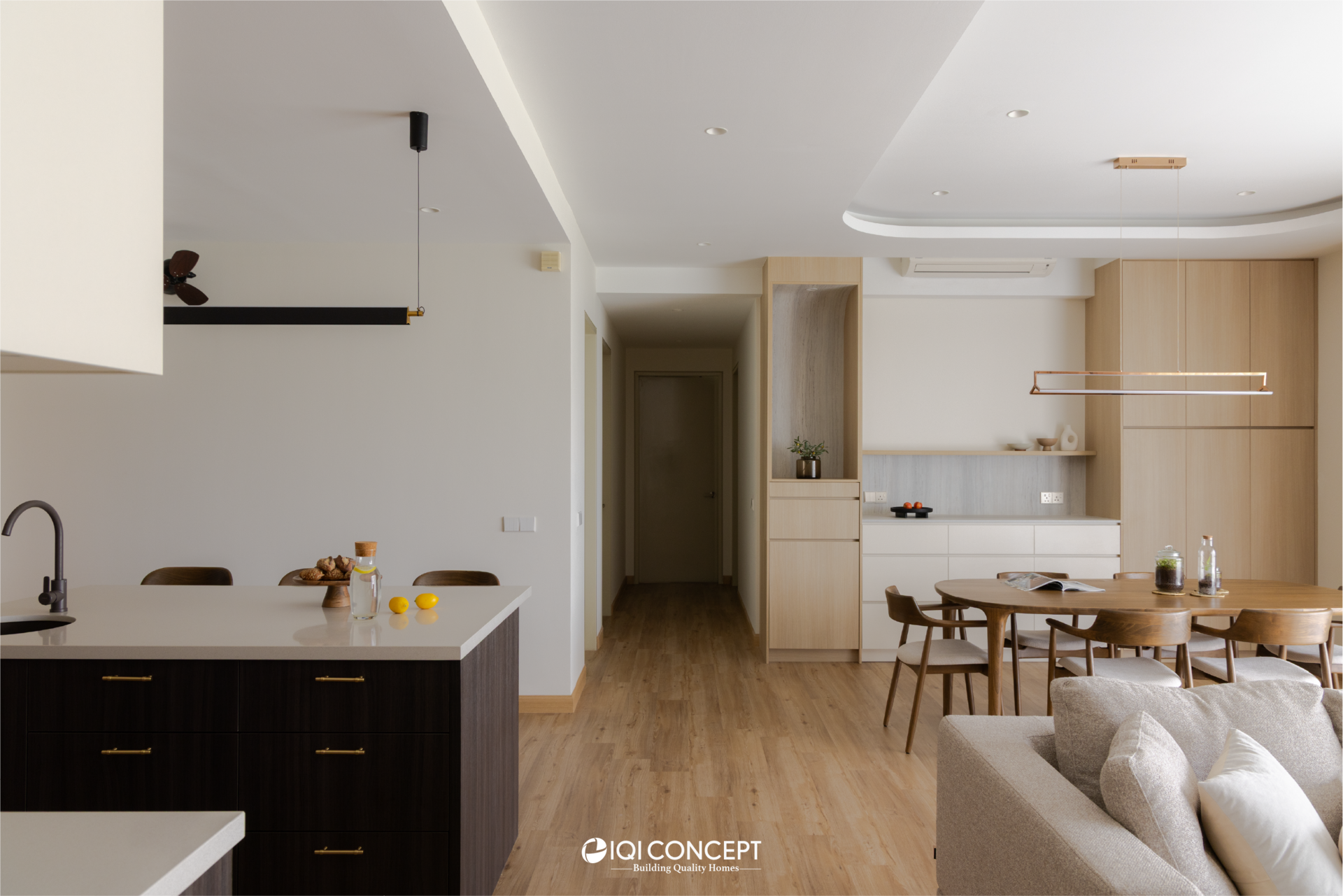A mix of light wood and deeper wood tones defines the dry kitchen, creating contrast while maintaining harmony within the overall palette. The island becomes the visual anchor of the space, finished in a deeper timber tone and paired with a light countertop to brighten the composition. A concealed walk-in pantry hidden behind custom carpentry doors ensure everyday functionality without compromising aesthetics.