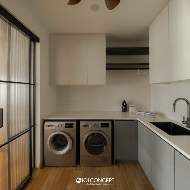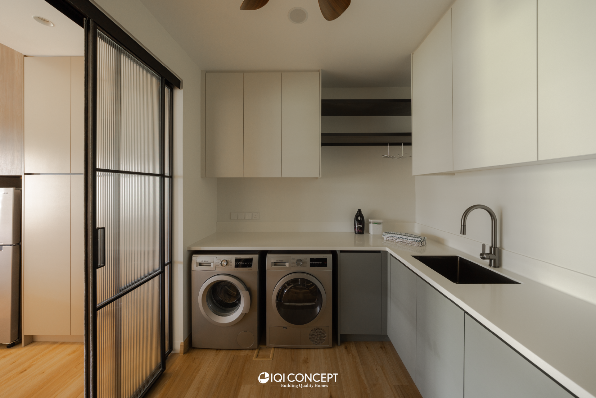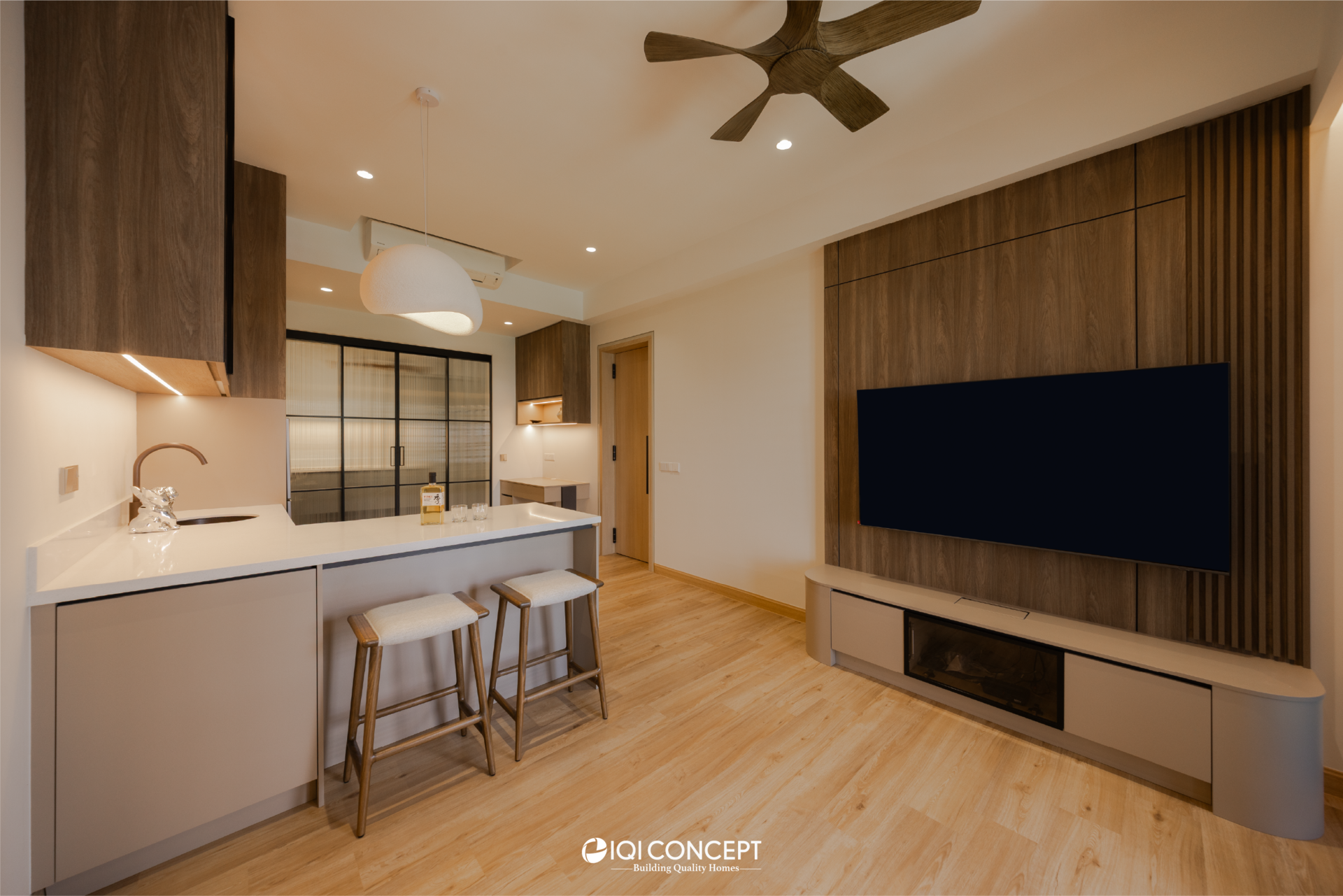 The entertainment room is accessed through a fluted feature door beside the TV wall. Inside, the space is wrapped in deeper timber finishes, creating a more intimate atmosphere. An island bar sits within the room, complemented by a sculptural pendant lamp above that adds a subtle design statement while enhancing the cosy ambience. Full-height wood panels and vertical fluted detailing frame the TV feature wall with understated elegance, shaping a comfortable retreat for movie nights. The fluted glass sliding door gently screens the laundry area, allowing light to filter through while maintaining visual continuity.