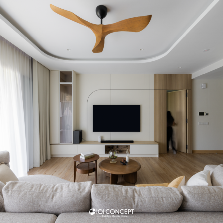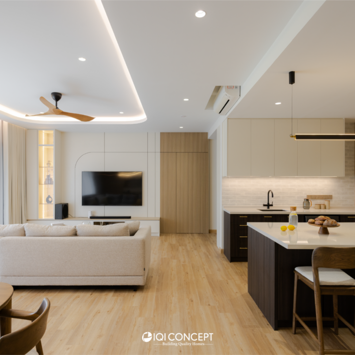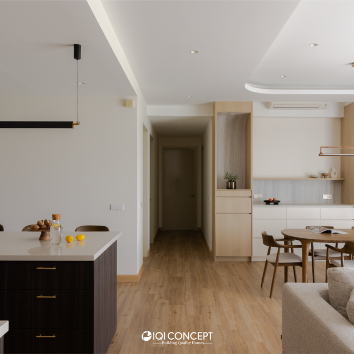 This condominium embraces a warm Scandinavian-rustic palette, where soft beige tones and layered timber textures create a calm yet inviting atmosphere. The living and dining areas are designed with clean lines and subtle detailing, allowing natural light to enhance the warmth of the wood finishes. Gentle curves, cohesive carpentry, and a balanced material selection bring softness to the open layout, forming a space that feels both refined and comfortable for everyday living.