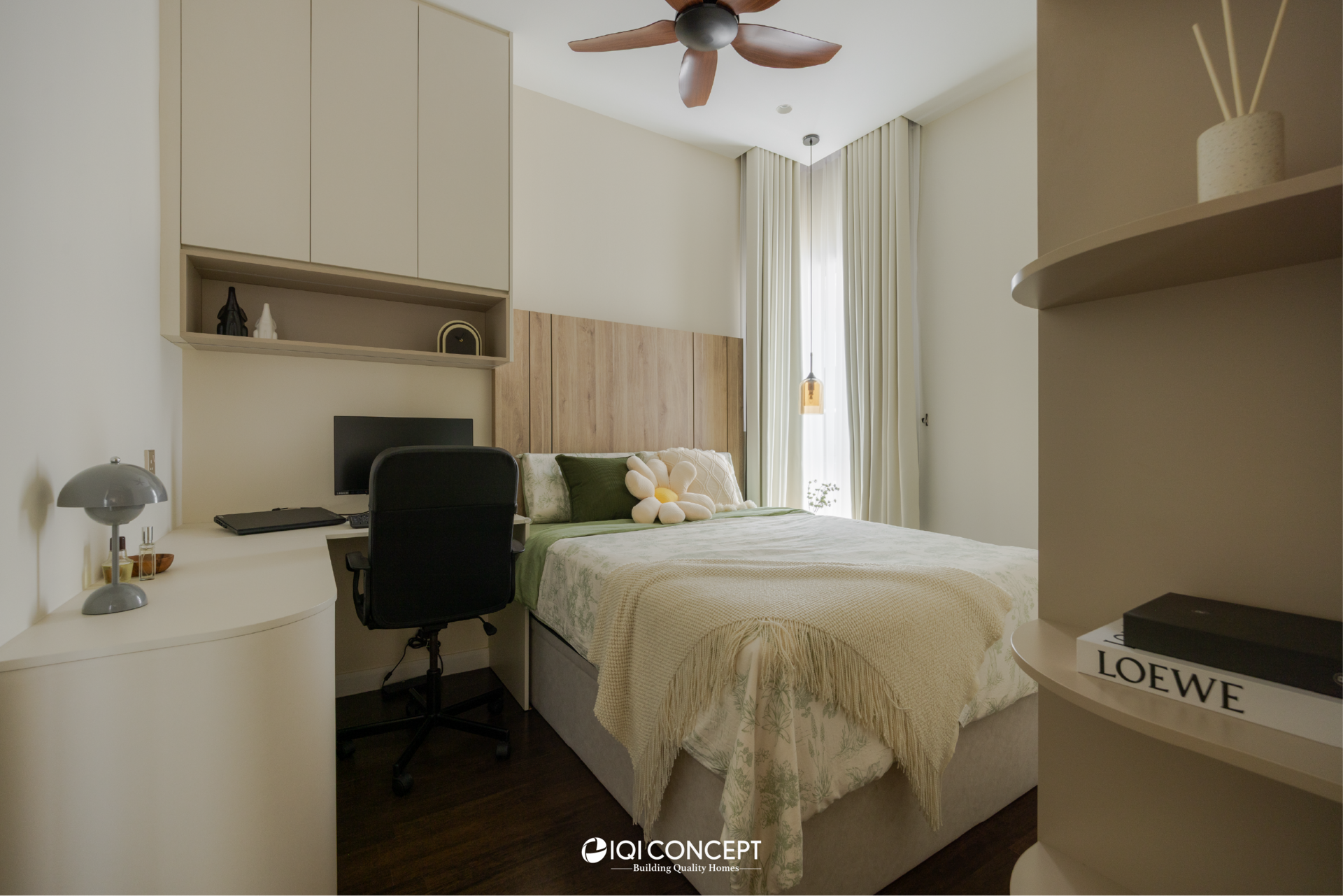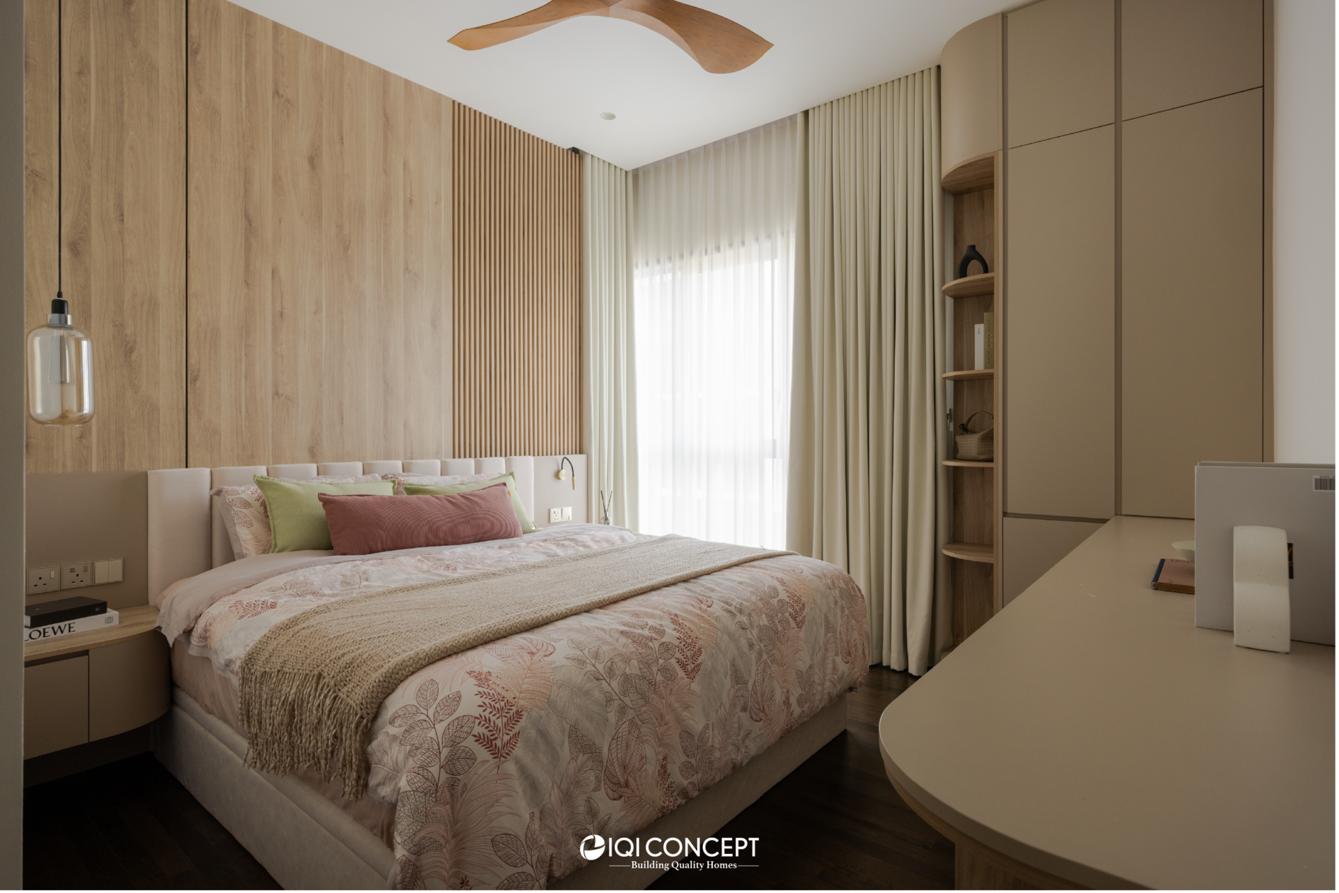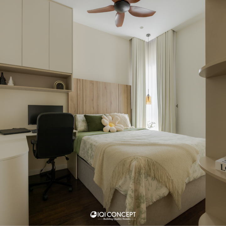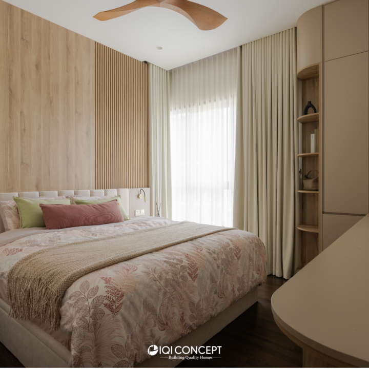 The bedroom continues the warmth of the home with soft timber finishes and a muted palette that promotes rest and relaxation. Built-in carpentry keeps the space streamlined and uncluttered, while layered textures add depth and quiet elegance. Completing the home with a sense of calm continuity.