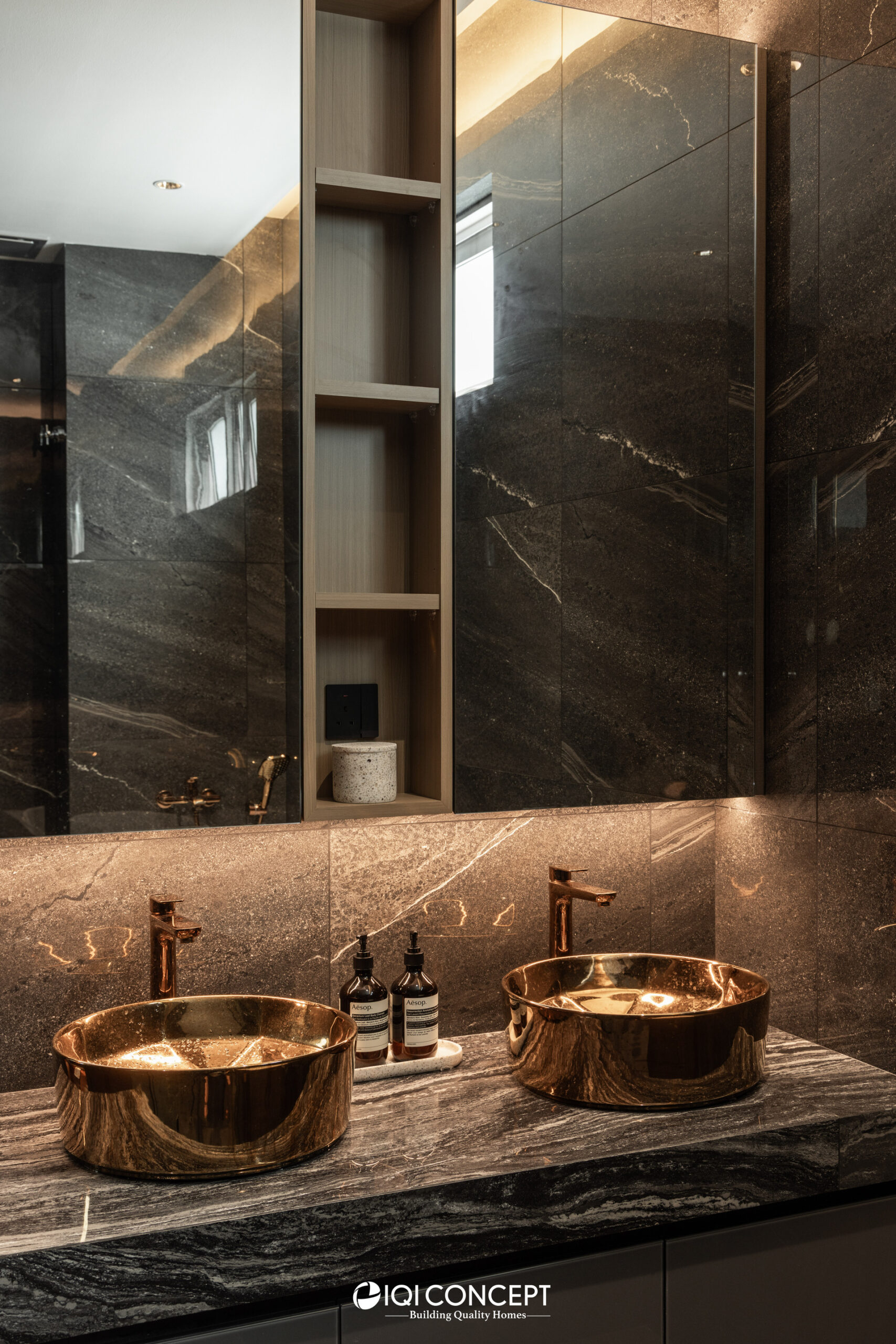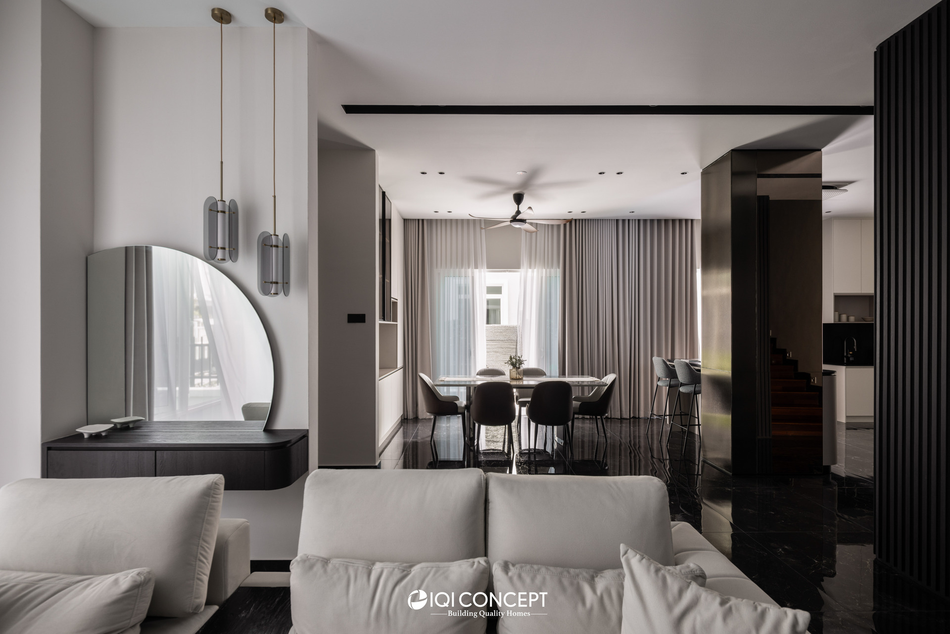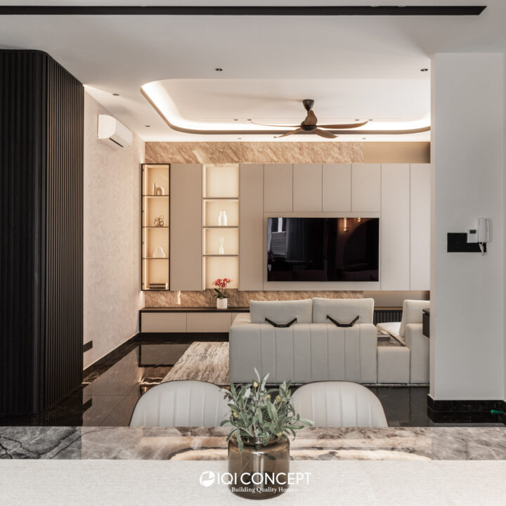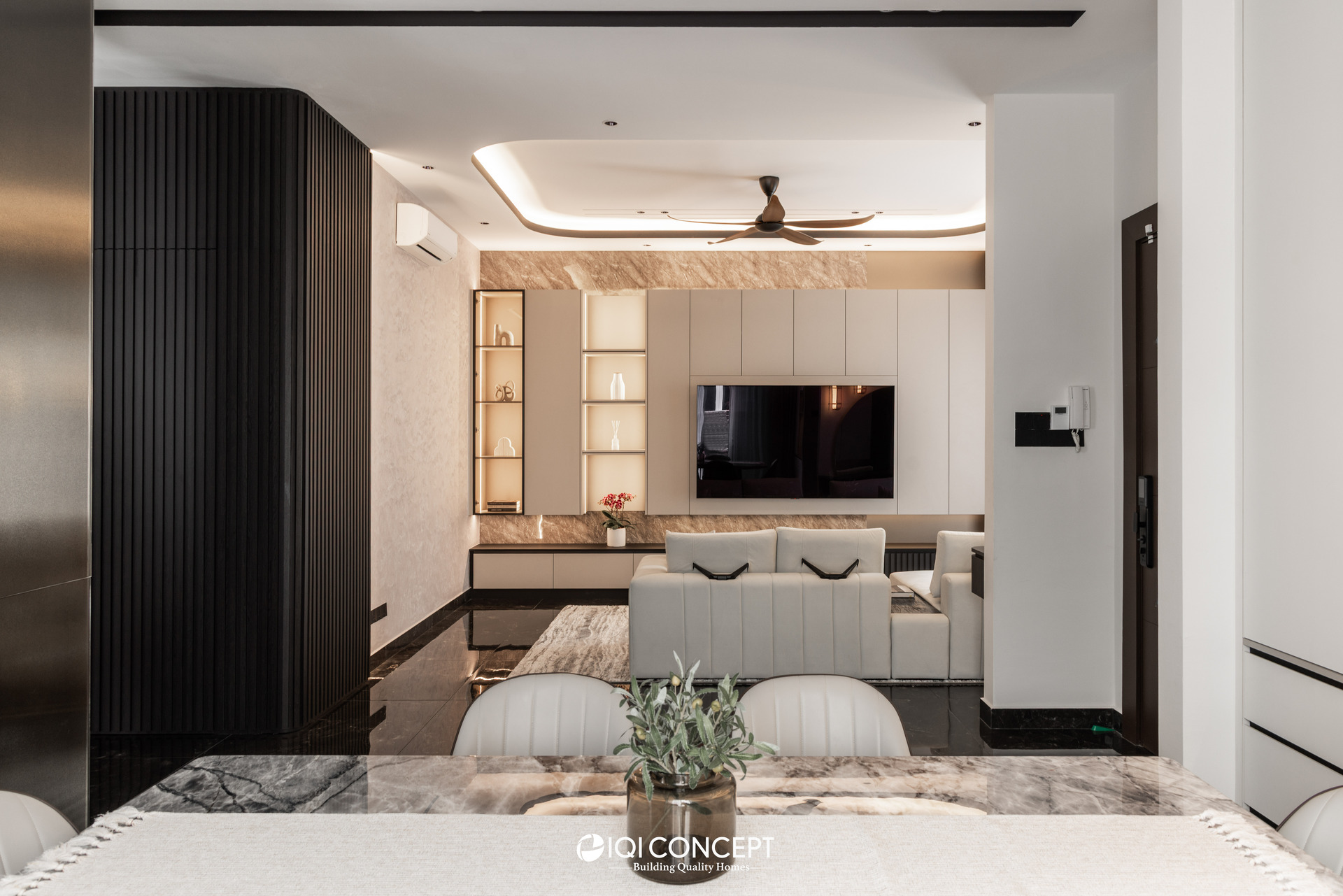 This Modern Luxury residence showcases the striking elegance of black marble veins across the living, bedrooms, and bathrooms, balanced with lighter tones and softened by warm ambient lighting. The result is a refined yet welcoming atmosphere, designed with both sophistication and family living in mind.