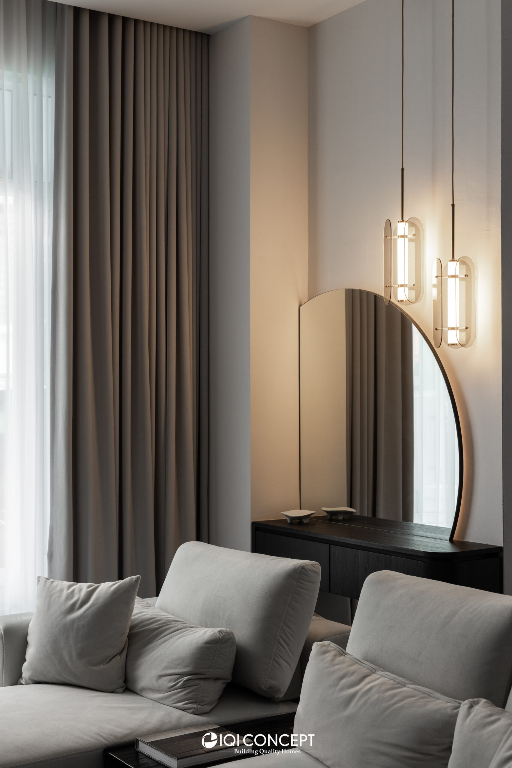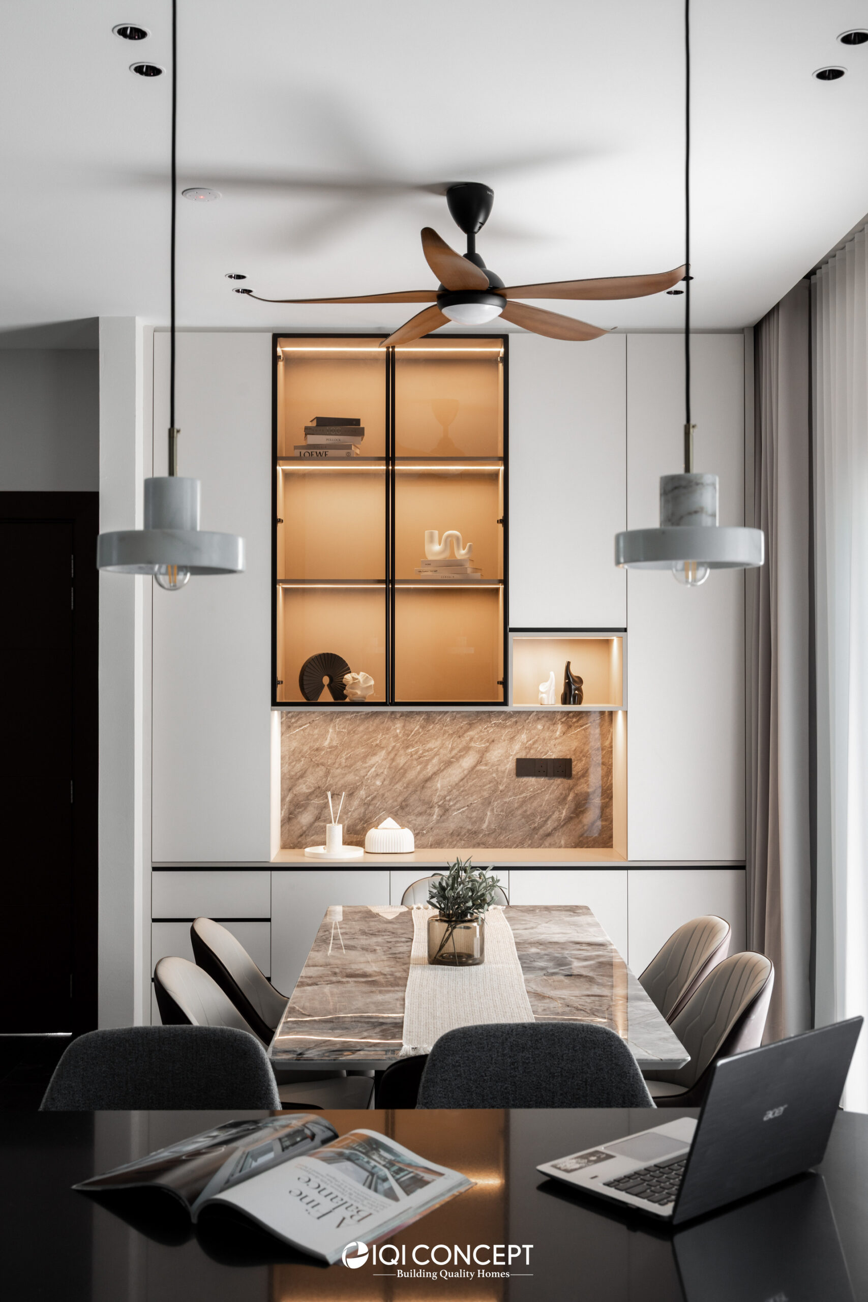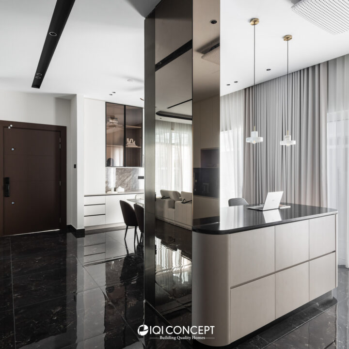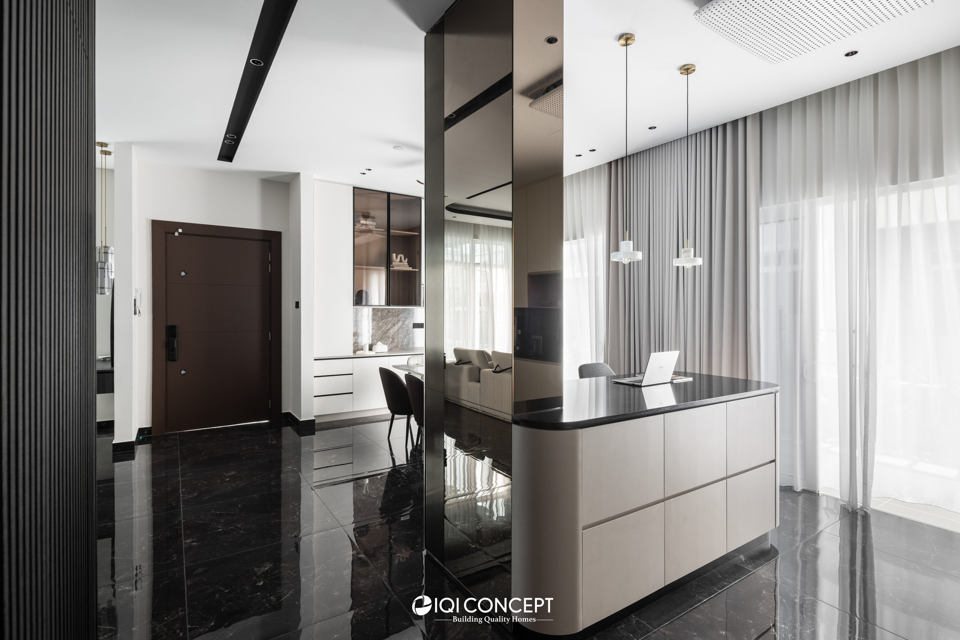 In the dry kitchen island area, the existing column was reimagined as a feature display cabinet, detailed with mirrored finishes. Inside, infinity glass enhances the display, adding both depth and sophistication while blending functionality with timeless luxury.
