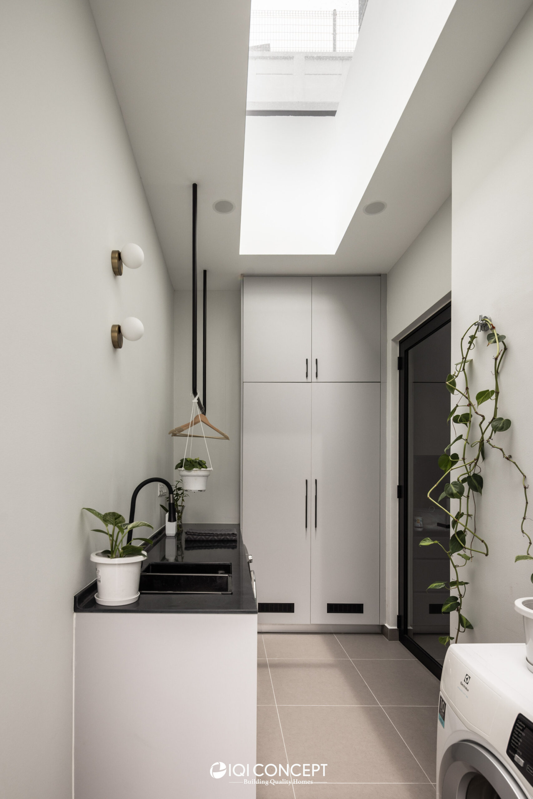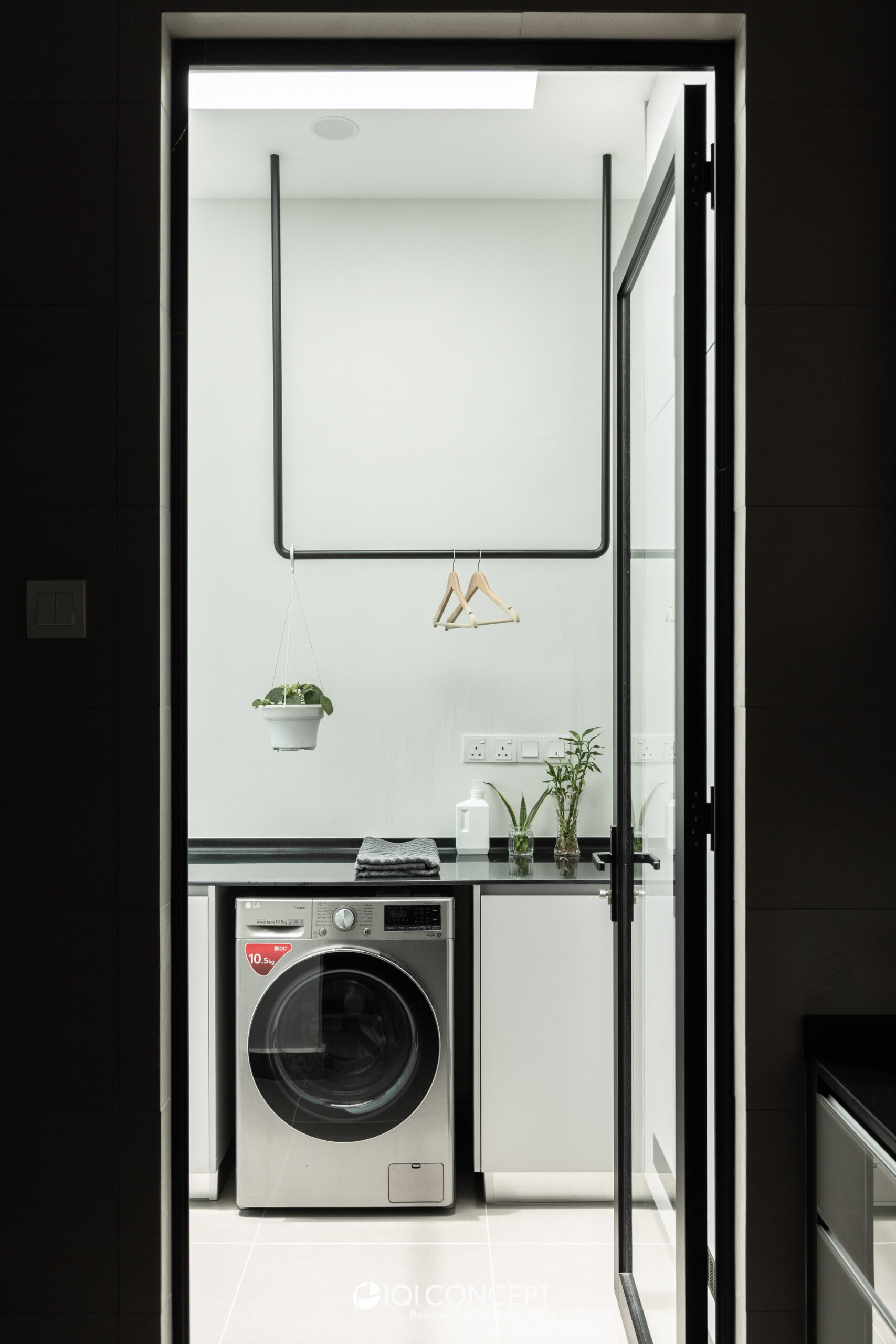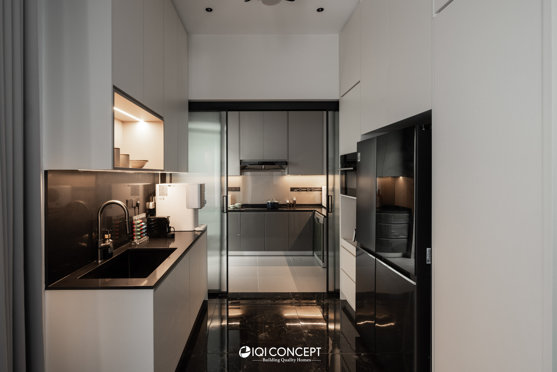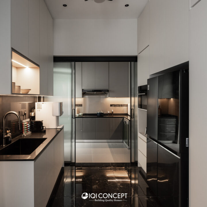 In the dry kitchen island area, the existing column was reimagined as a feature display cabinet, detailed with mirrored finishes. Inside, infinity glass enhances the display, adding both depth and sophistication while blending functionality with timeless luxury.