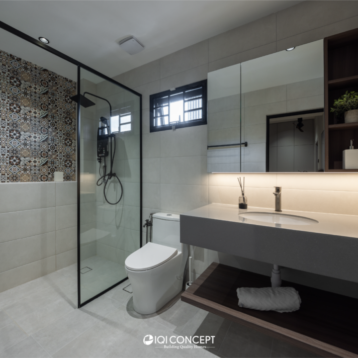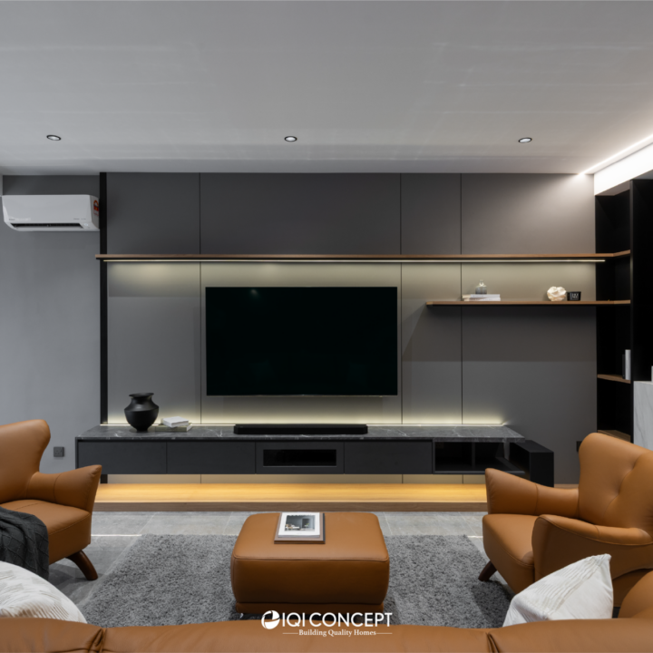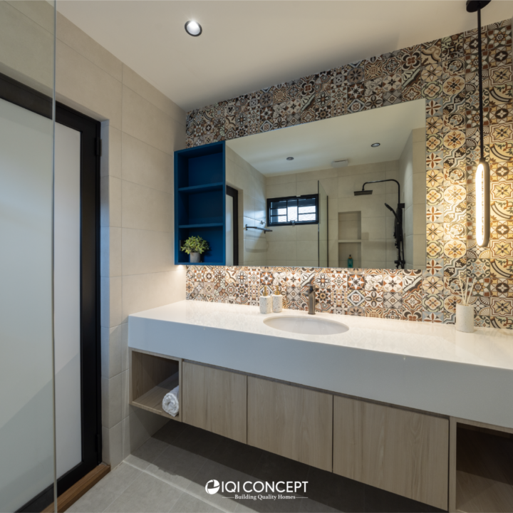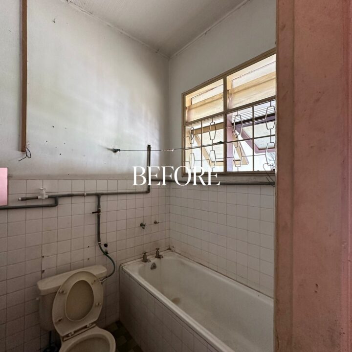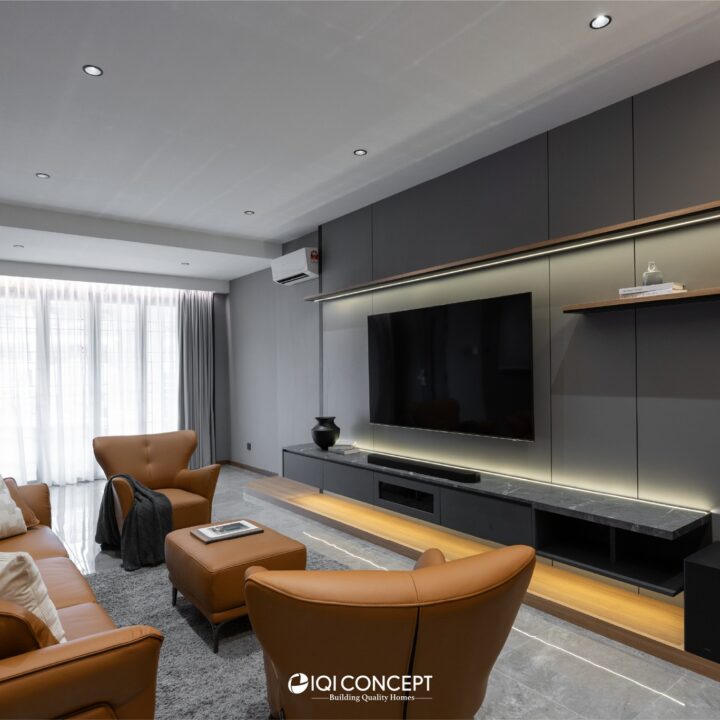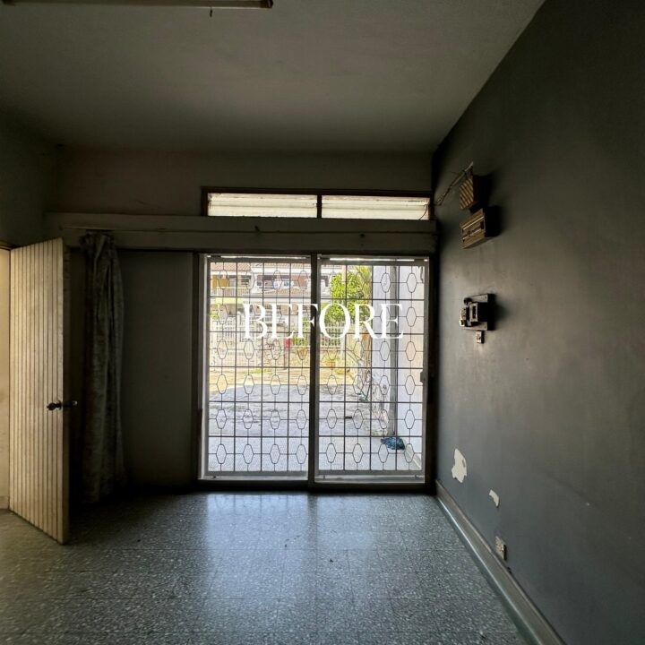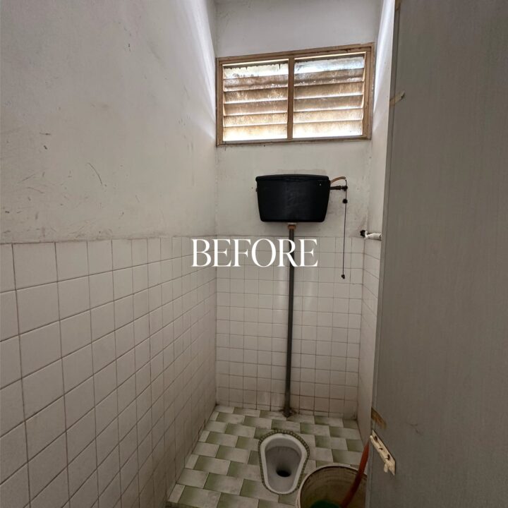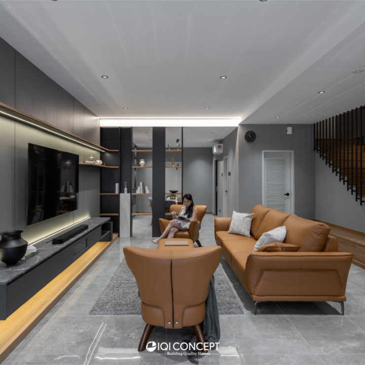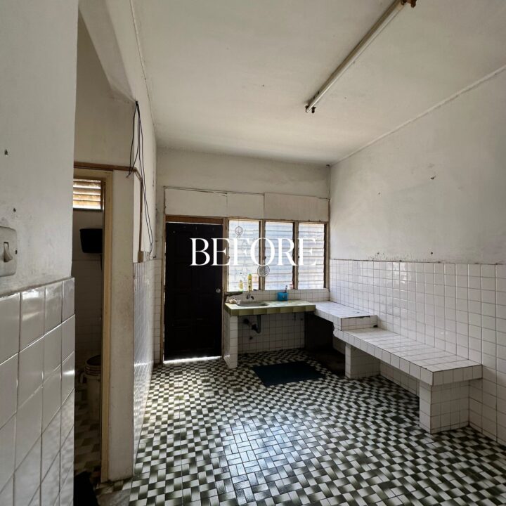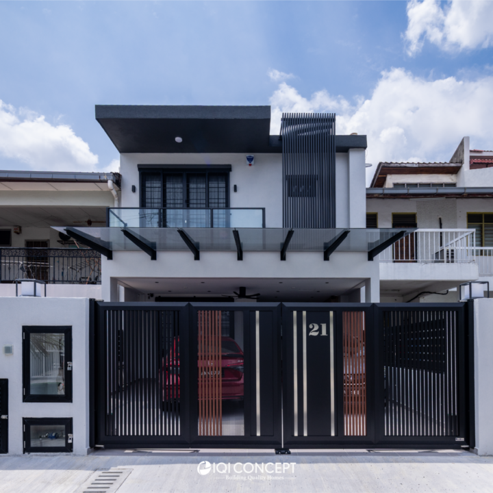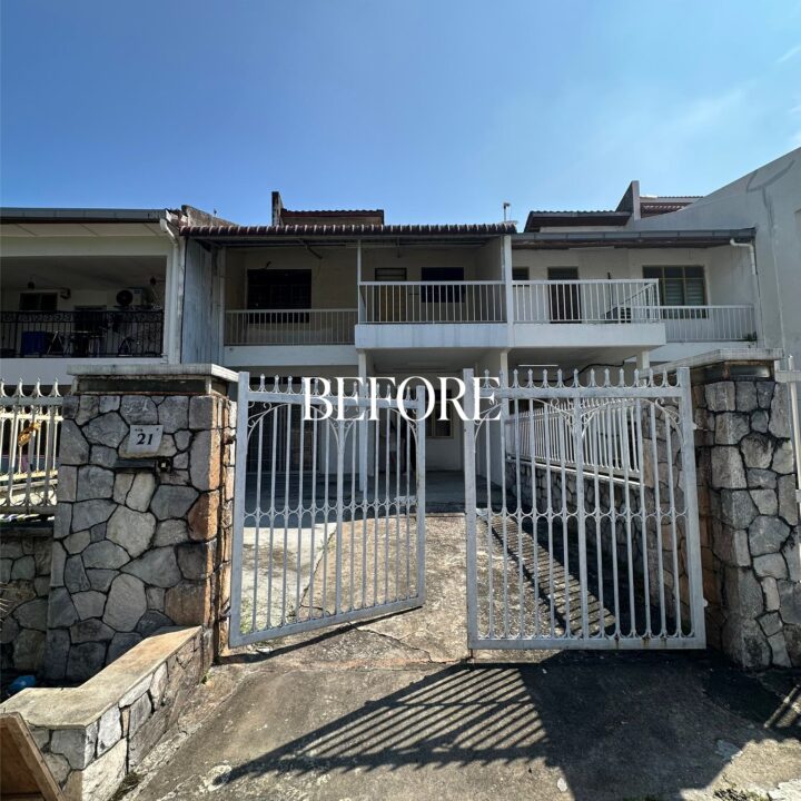 The kitchen was upgraded with a grey-wood palette and contemporary cabinetry, complementing the open layout, while the powder room features half-height retro wall tiles for a cozy yet spacious feel. On the exterior, the first-floor façade was refreshed with vertical louvers that harmonize with the autogate’s design, and the shoe rack area features stylish black retro tiles, adding both function and visual appeal. The result is a mature yet inviting transformation, darker in tone yet balanced with warmth and tailored for modern living while honoring the charm of a long-standing home.