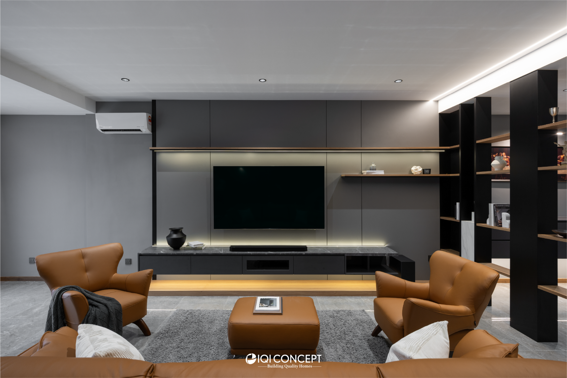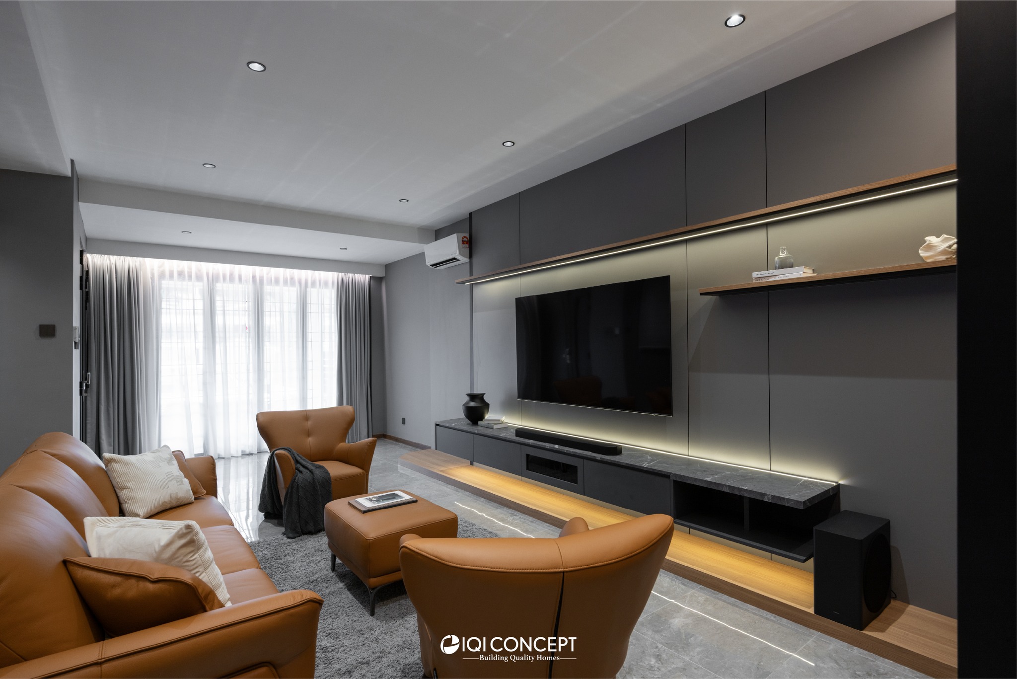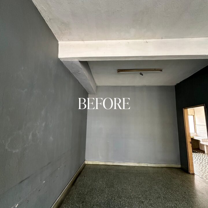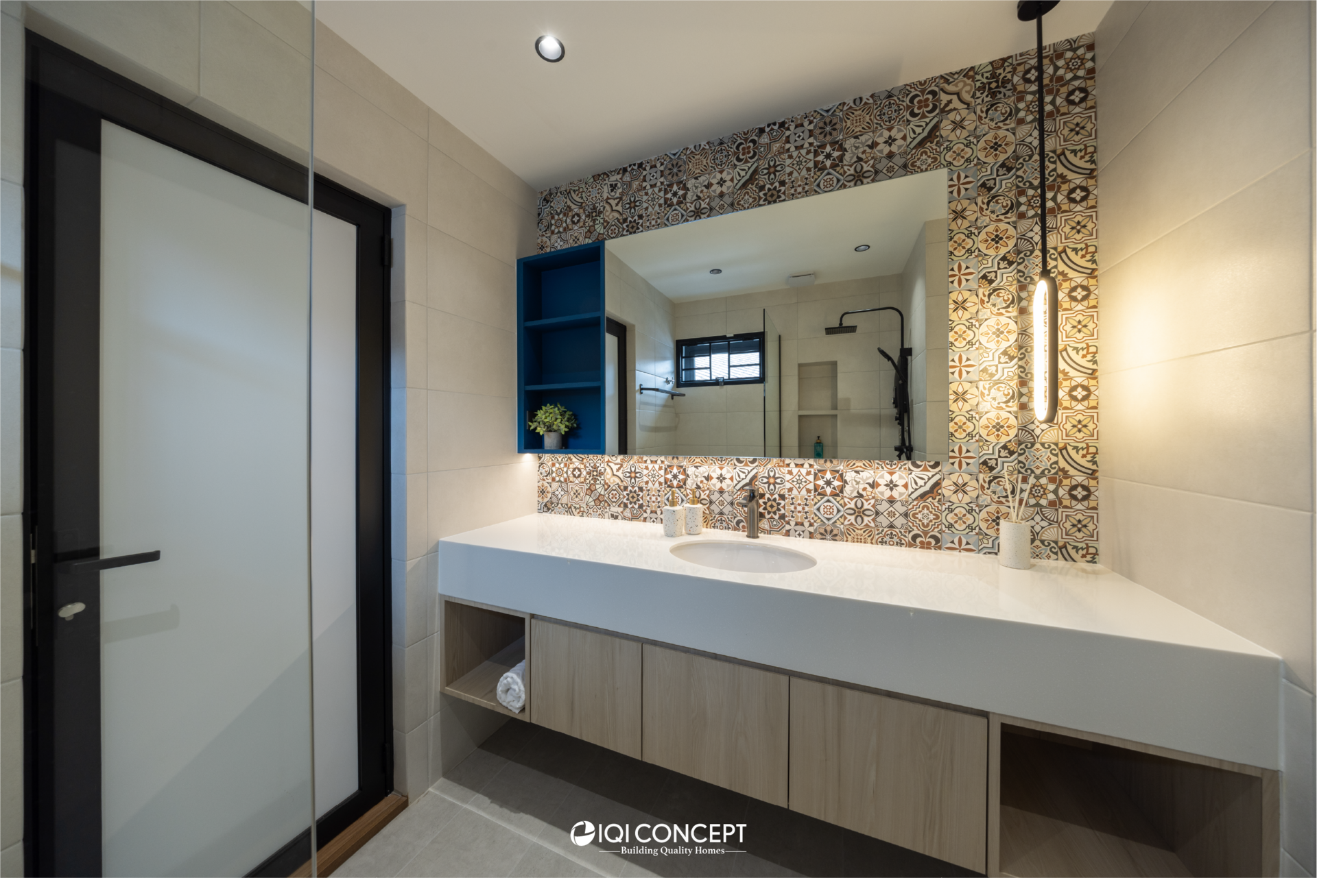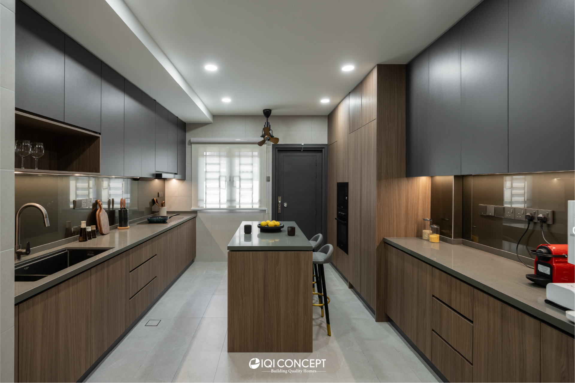 The kitchen was upgraded with a grey-wood palette and contemporary cabinetry, complementing the open layout, while the powder room features half-height retro wall tiles for a cozy yet spacious feel. On the exterior, the first-floor façade was refreshed with vertical louvers that harmonize with the autogate’s design, and the shoe rack area features stylish black retro tiles, adding both function and visual appeal. The result is a mature yet inviting transformation, darker in tone yet balanced with warmth and tailored for modern living while honoring the charm of a long-standing home.