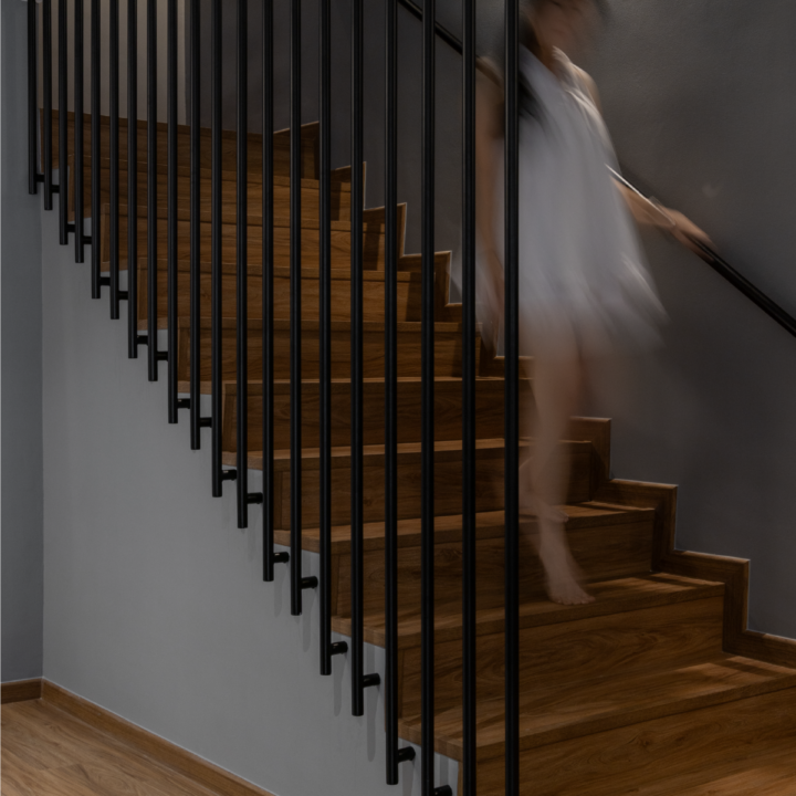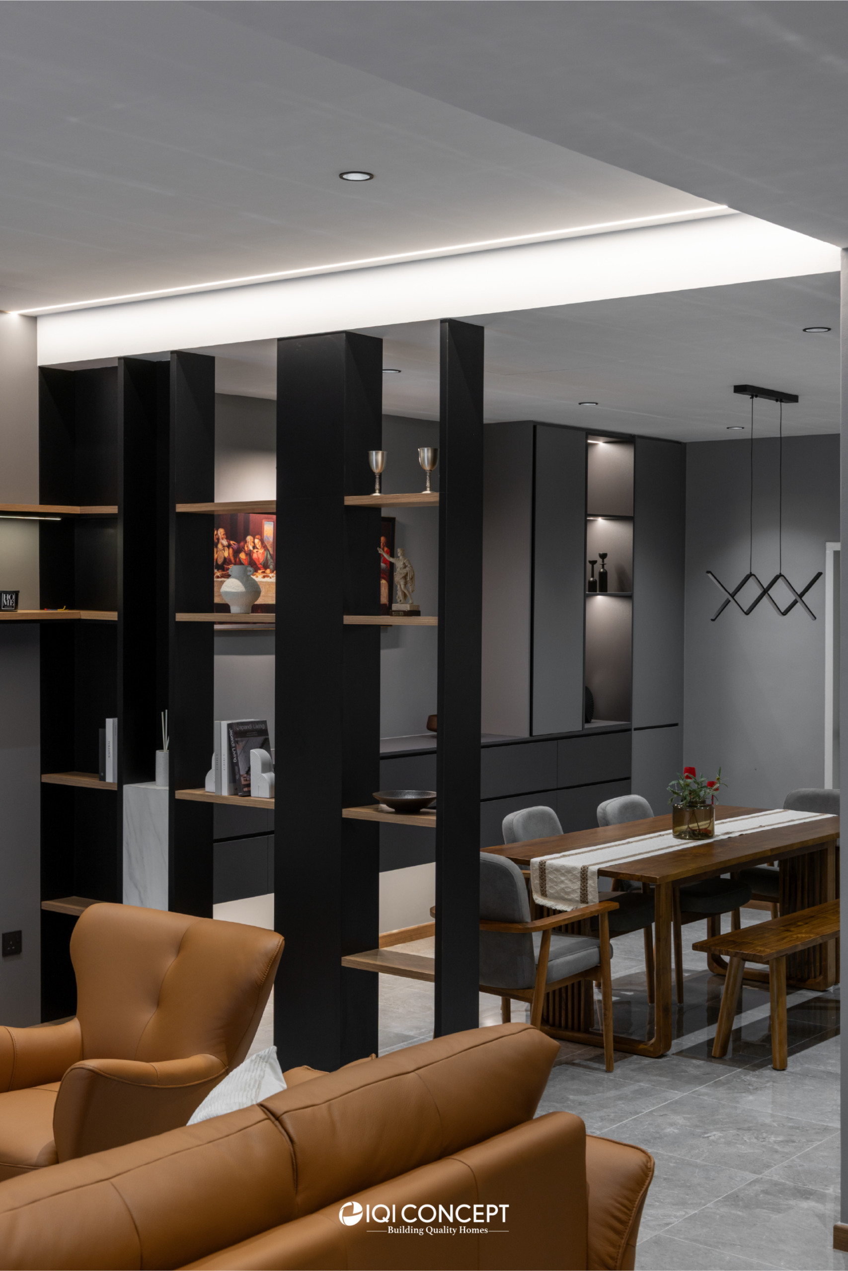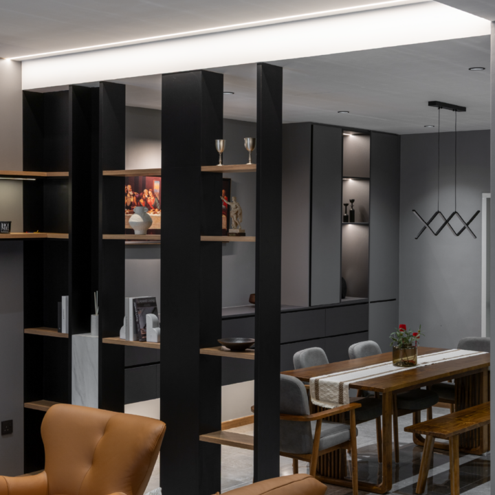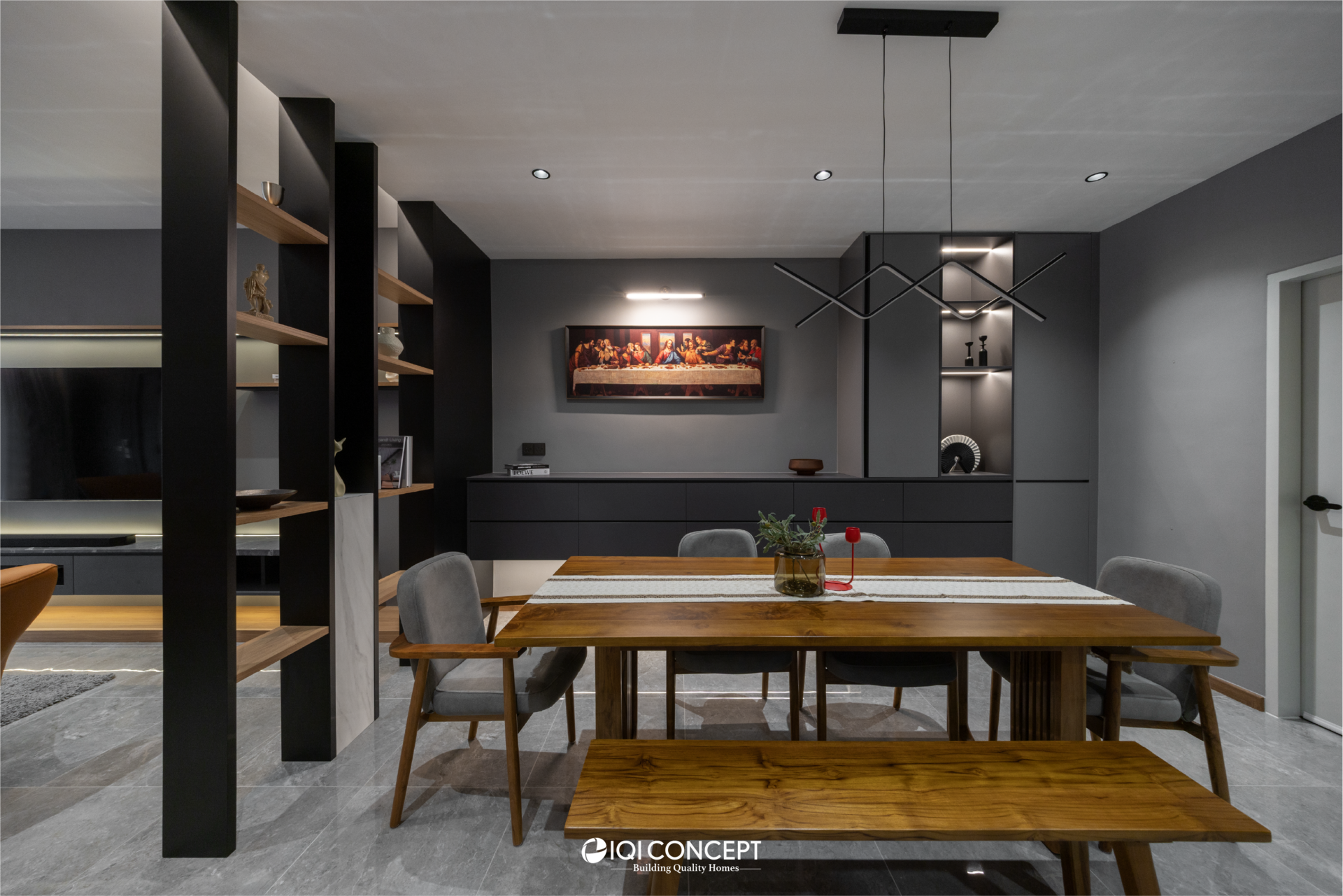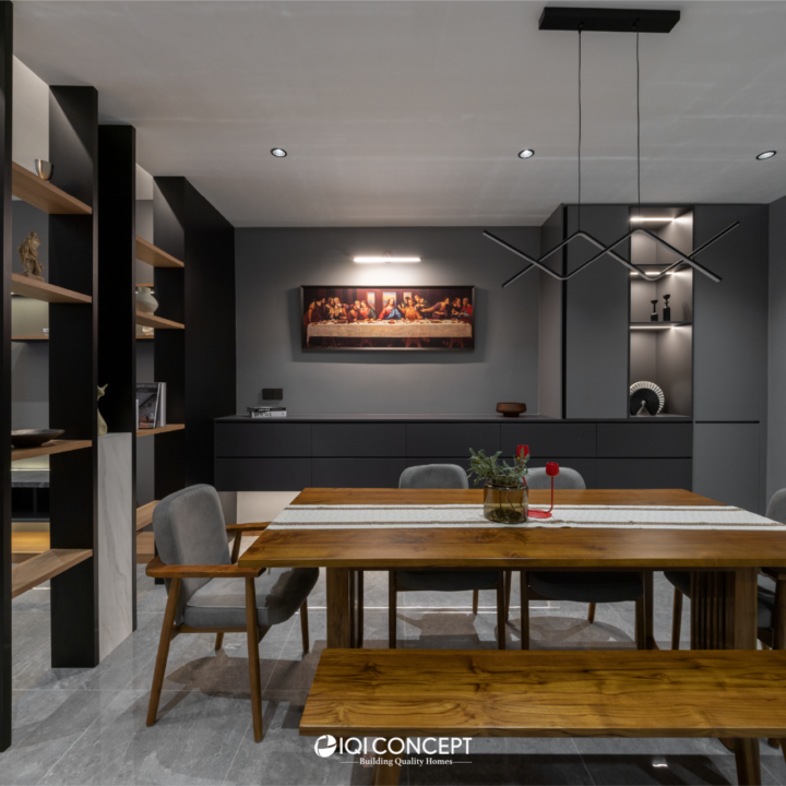 A 60-year-old home was thoughtfully transformed with a Modern Dark design approach, blending grey tones with warm wood textures to give the space a refined, contemporary character while respecting its original structure. Through front and rear extensions, the layout was refreshed to improve flow and functionality. In the living and dining areas, the existing beam inspired a divider display cabinet, which creates separation without blocking light while providing a space to showcase the owner’s collectibles. The staircase features a sleek steel railing with a landing for both style and practicality, and in the dining area, the owner’s Last Supper painting takes center stage on the wall and is highlighted with a feature wall light.