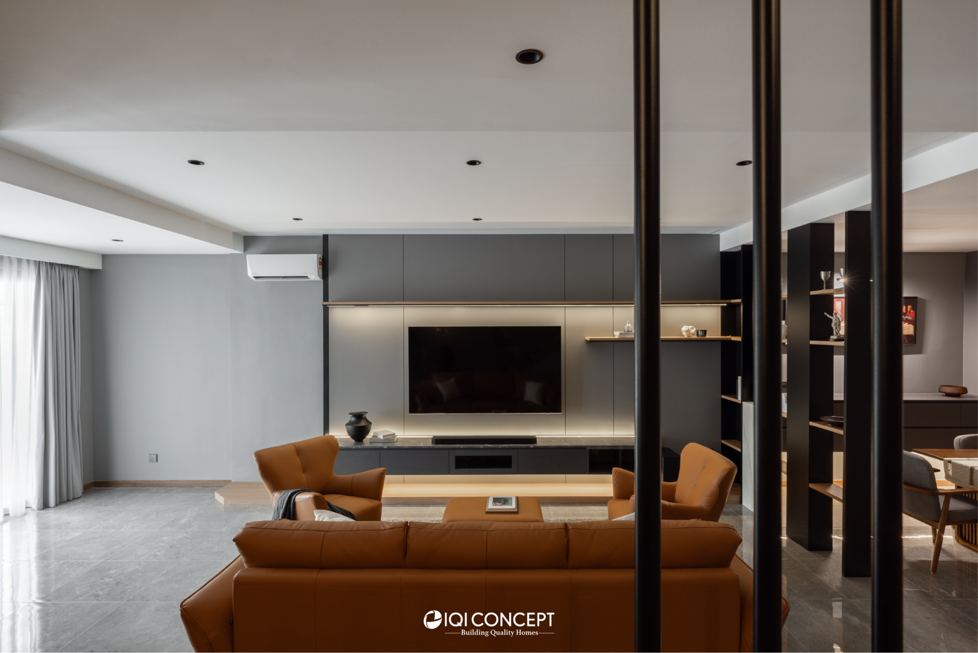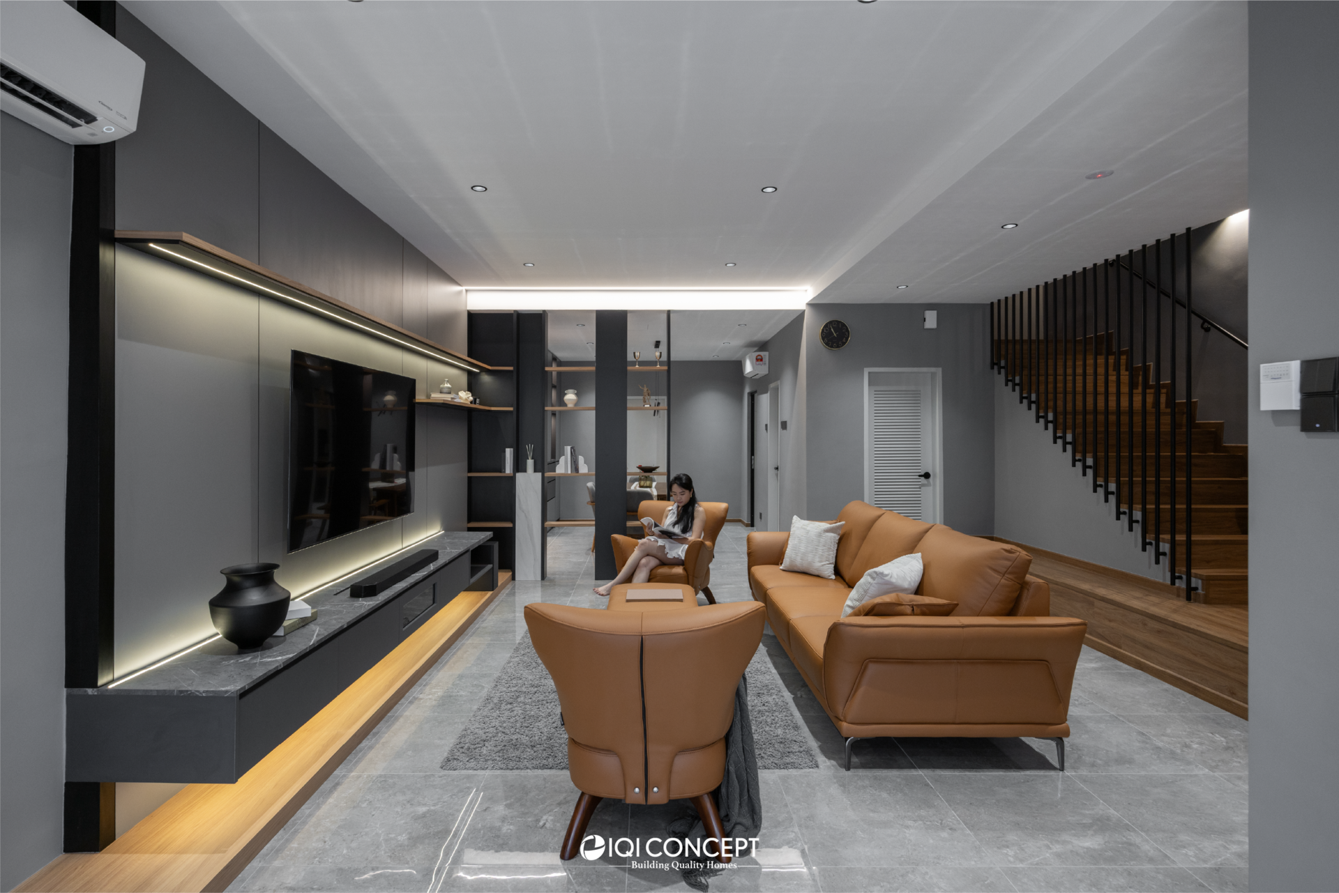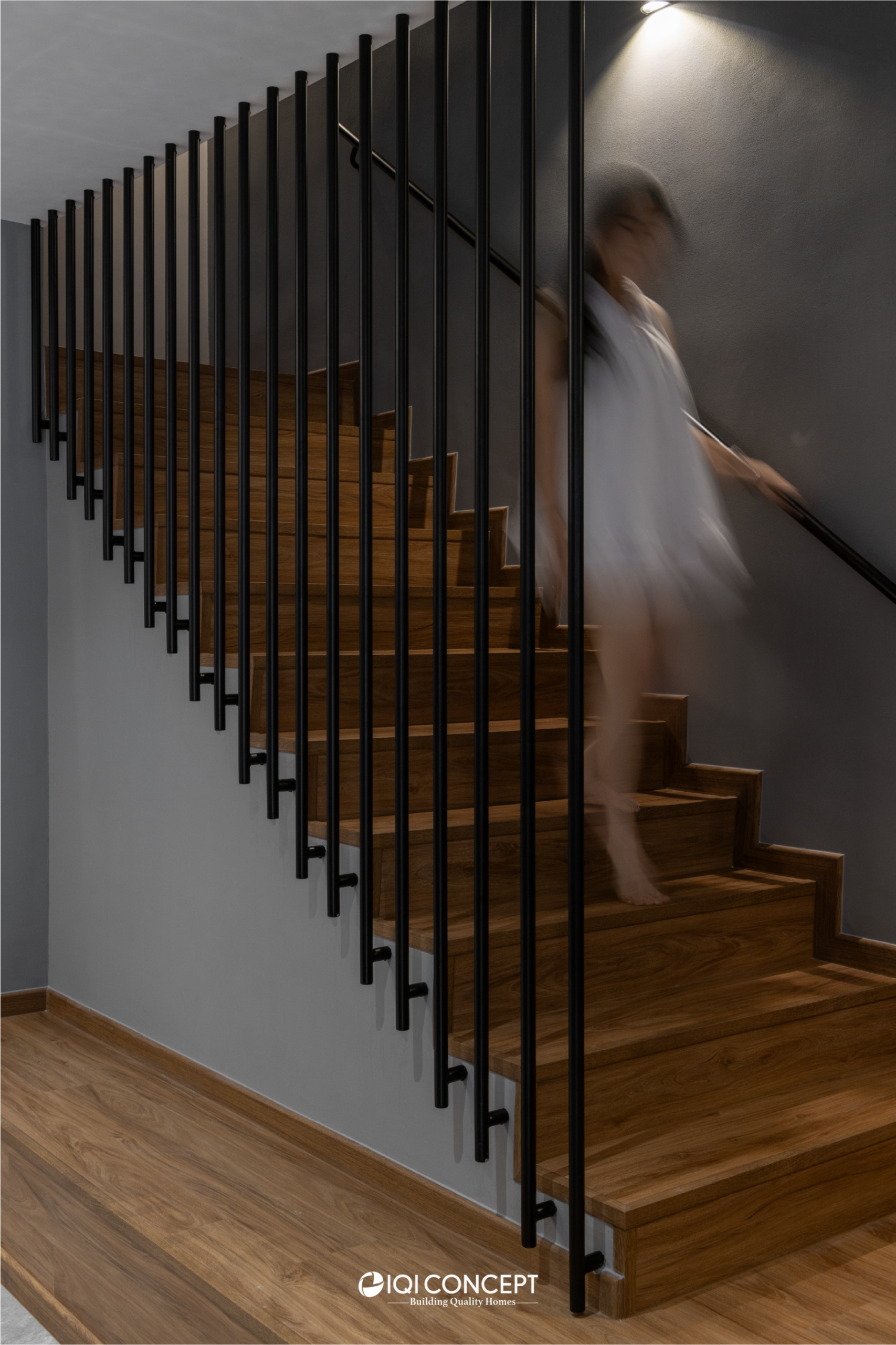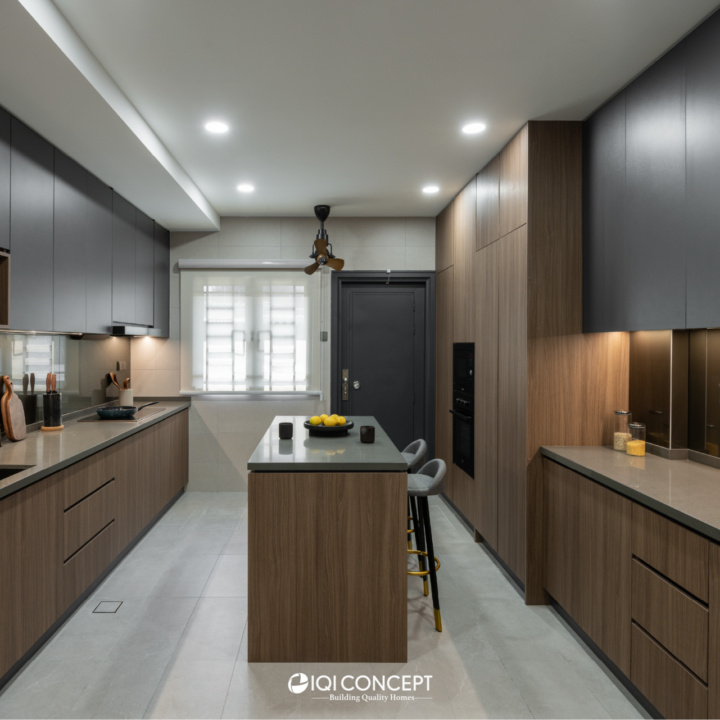 A 60-year-old home was thoughtfully transformed with a Modern Dark design approach, blending grey tones with warm wood textures to give the space a refined, contemporary character while respecting its original structure. Through front and rear extensions, the layout was refreshed to improve flow and functionality. In the living and dining areas, the existing beam inspired a divider display cabinet, which creates separation without blocking light while providing a space to showcase the owner’s collectibles. The staircase features a sleek steel railing with a landing for both style and practicality, and in the dining area, the owner’s Last Supper painting takes center stage on the wall and is highlighted with a feature wall light.